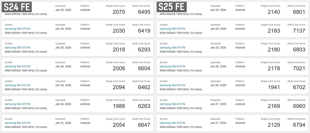 최근 긱벤치6에 공개된 벤치마크 점수의 평균값을 살펴보면 싱글코어 2108점, 멀티코어 6794점으로 측정됐으며 전작 대비 성능이 조금 개선된 것을 확인할 수 있습니다. 하지만, 갤럭시 S25 시리즈의 싱글코어가 2700점대 이상의 점수를 기록하는 것과 비교하면 다소 아쉬운 수치입니다.