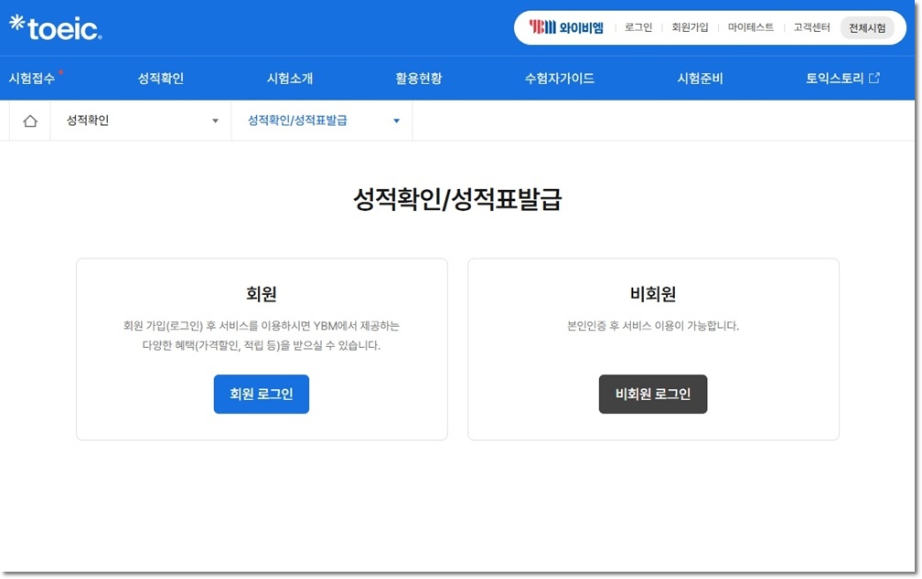 토익 시험 접수나 성적 확인은 휴대폰, 아이핀, 신용카드 인증 등 비회원으로도 진행할 수 있습니다.
