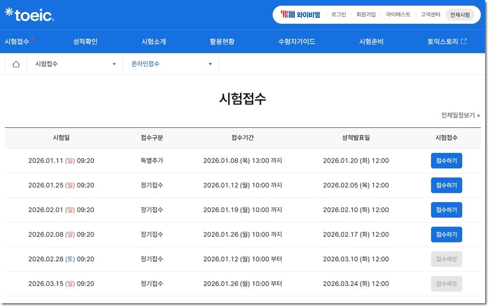 토익 시험 접수 및 성적 확인은 YBM 토익 공식 사이트에서 진행하실 수 있습니다.