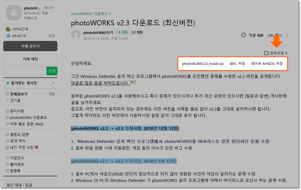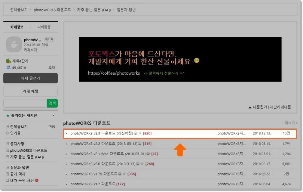 다운로드 게시글은 카페 대문 바로 아래에 위치해 있으며, ‘photoWORKS v2.3 다운로드(최신버전)’ 제목의 게시글을 클릭하시면 됩니다.