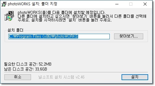 설치 폴더를 지정한 후 [설치] 버튼을 누르기만 하면 되며, 설치에 필요한 용량은 약 52.2MB로 매우 적은 편입니다.